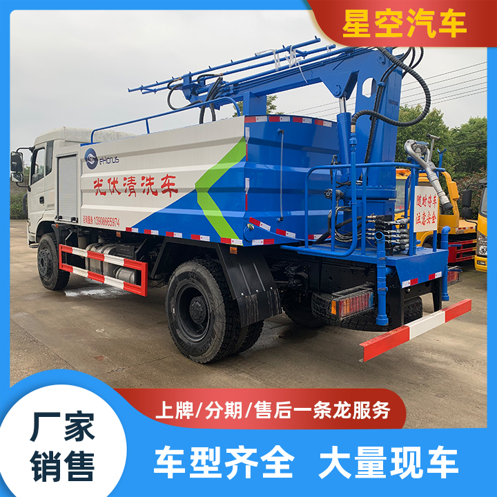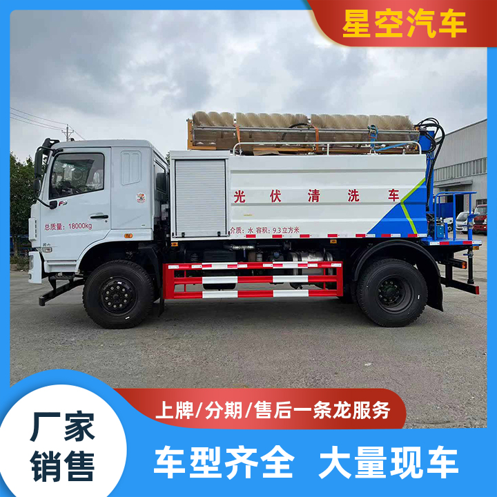 一、整车概述 车辆满足国Ⅵ排放标准,车辆具备柴油四驱越野功能。车辆配置两轴六轮胎,上装配备罐体容积9.3方左右,采用5mm厚Q235碳钢板, 罐体内部做防腐处理,外部先喷防锈漆,在做面漆,罐体上部设置人孔、进水孔,消防接口,车带吸水管、带自流阀、在水系统最低处设置排水阀。标配德国品孚170L/Min流量高压柱塞泵,玉柴78马力副发动机(高配德国品孚230L/min流量高压柱塞泵,玉柴160马力副发动机),优质电磁阀组,油缸等元器件。带三套操作系统(一个遥控器,副驾驶一个控制盒,一套机械臂底端操作手柄),光伏清洗车尾部安装旋转清洗吊臂,液压泵,可360°旋转,清洗臂可适应板面做上下、翻转、伸缩动作,满足清洗任务,罐体和滤杯间加总出阀门,冬季气动排水。 东风越野底盘,康明斯230马力国六发动机,多功能方向盘,法士特8档变速箱(带高低速),东风德纳3.6吨前桥,东风德纳10吨后桥,10.00R20钢丝胎,行车记录仪,铝合金油箱,原装空调,原装取力器,电动门窗。 高寒防尘款:主发动机与副发动机均配备东风原厂辅热系统以保证车辆在-40℃正常运行;车辆电瓶及气管均可在-40℃正常工作;整机液压密封件均采用低温材质。 可加装配置:高压喷枪、360°全方位行车记录仪、夜间工作照明灯、副油箱。