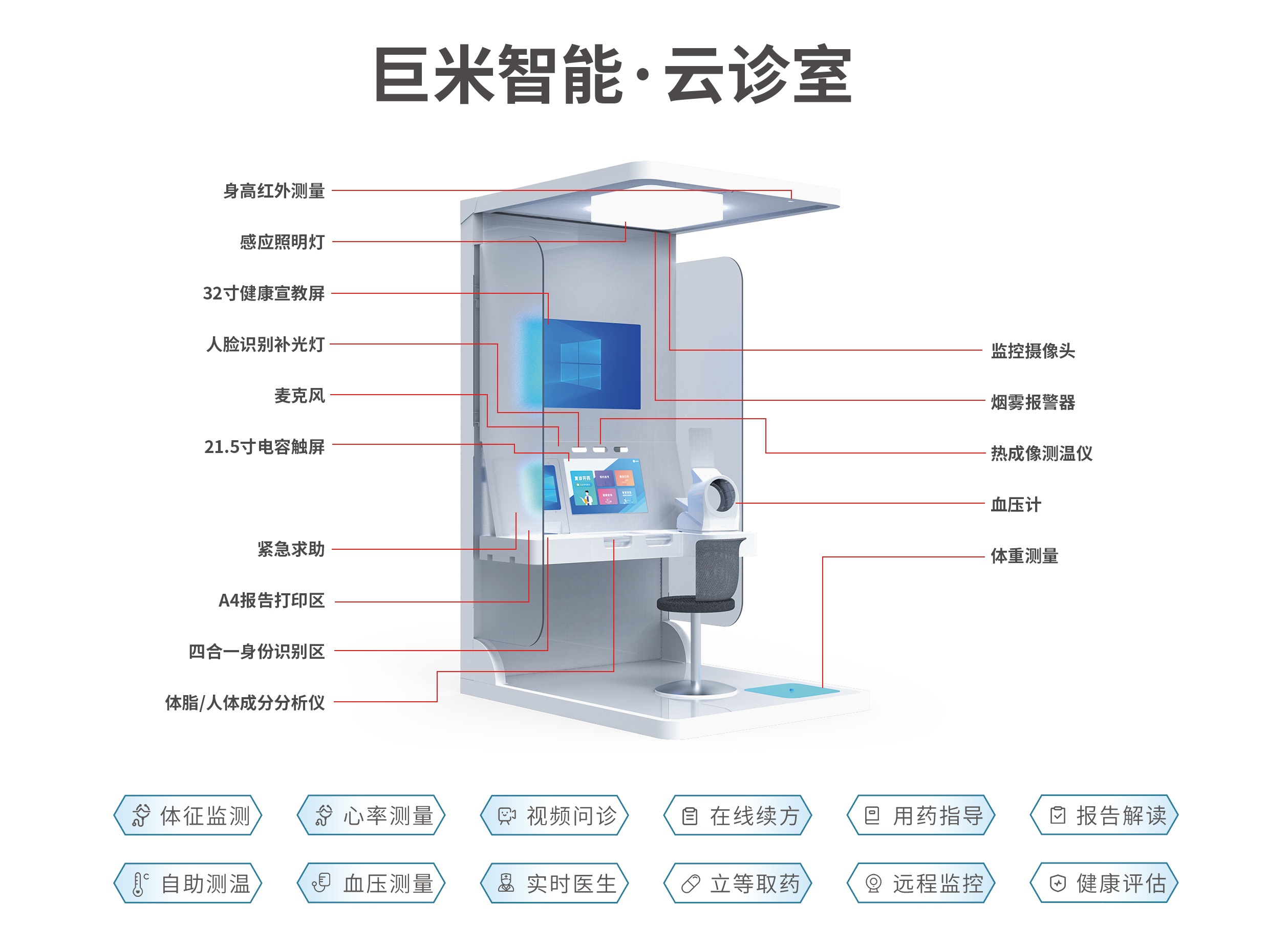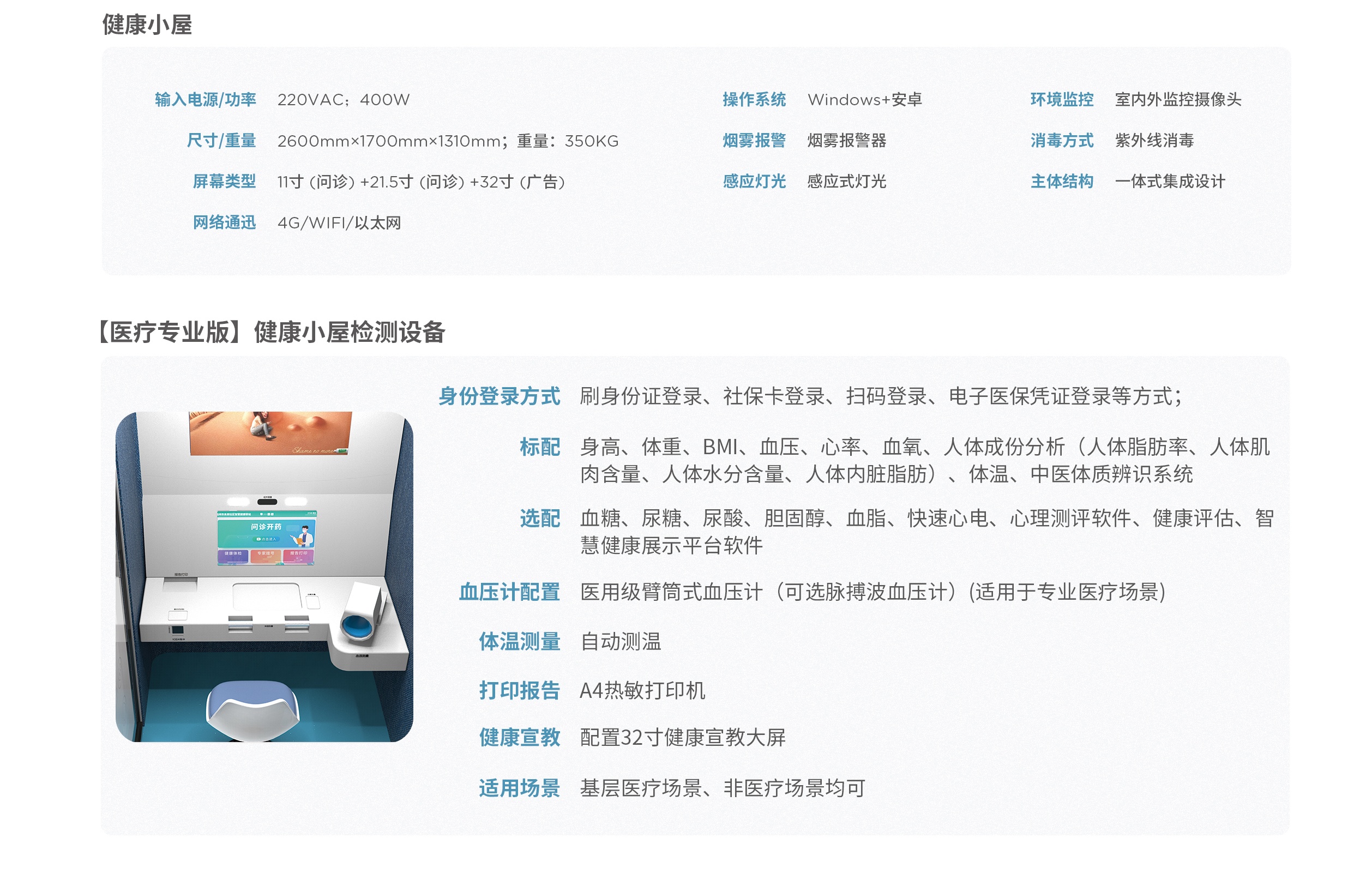 规格尺寸: 2600*1700*1310mm 血压心率检测: 支持 支付方式: 移动支付 尿糖尿酸检测: 支持 胆固醇检测: 支持 身高体重BMI检测: 支持 快速心电检测: 支持 健康报告: 支持打印或微信扫码查看 等级: 一级 打印机: A4热敏打印机 屏幕尺寸: 32英寸触摸显示屏