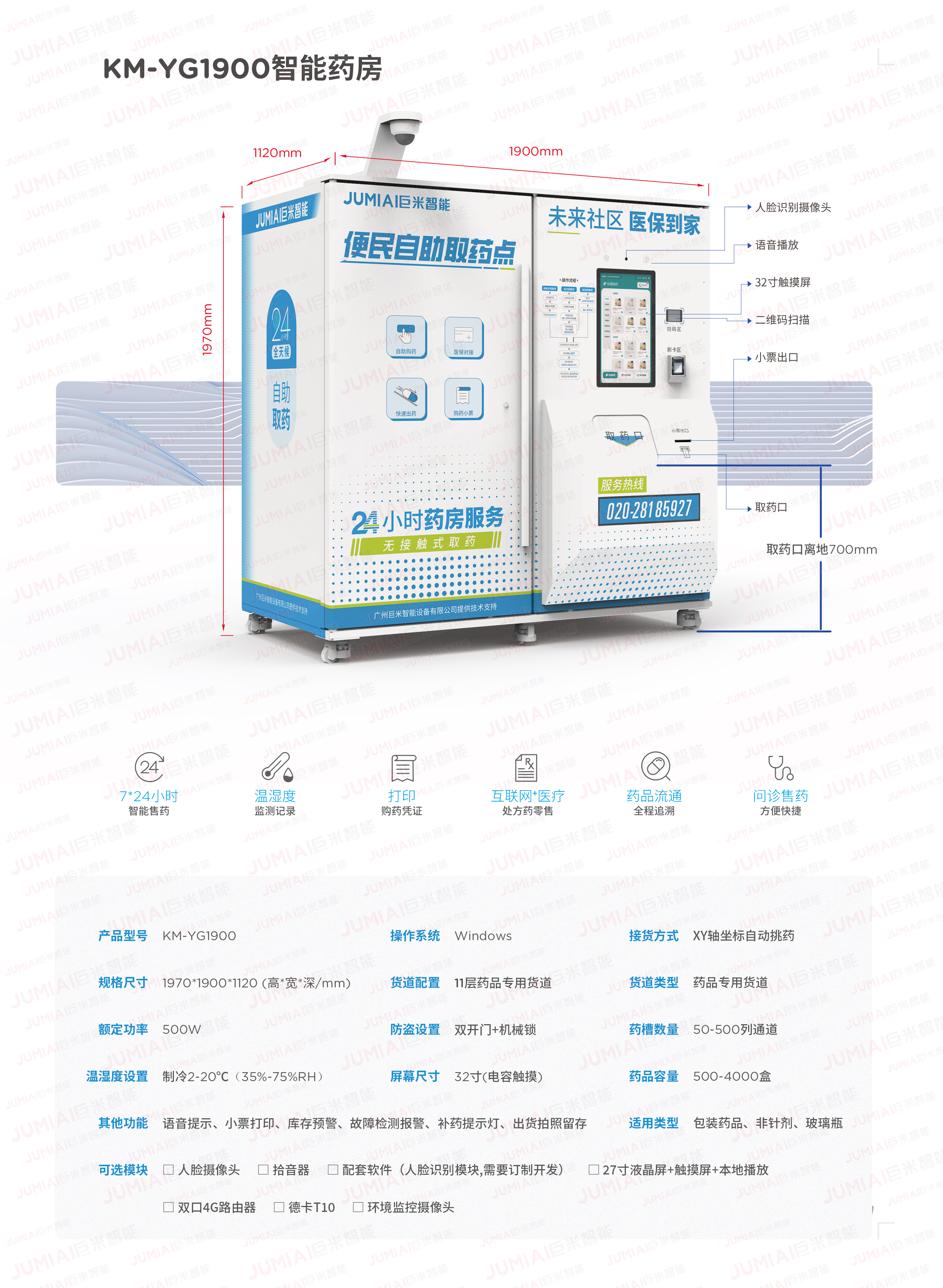产品型号: KM-YG1900 操作系统: Windows 接货方式: XY轴坐标自动挑药 规格尺寸: 1970*1900*1120(高"宽"深/mm) 货道配置: 11层药品专用货道 货道类型: 药品专用货道 额定功率: 500W 防盗设置: 双开门+机械锁 药槽数量: 50-500列通道 温湿度设置: 制冷2-20°C(35%-75%RH) 屏幕尺寸: 32寸(电容触摸) 药品容量: 500-4000盒