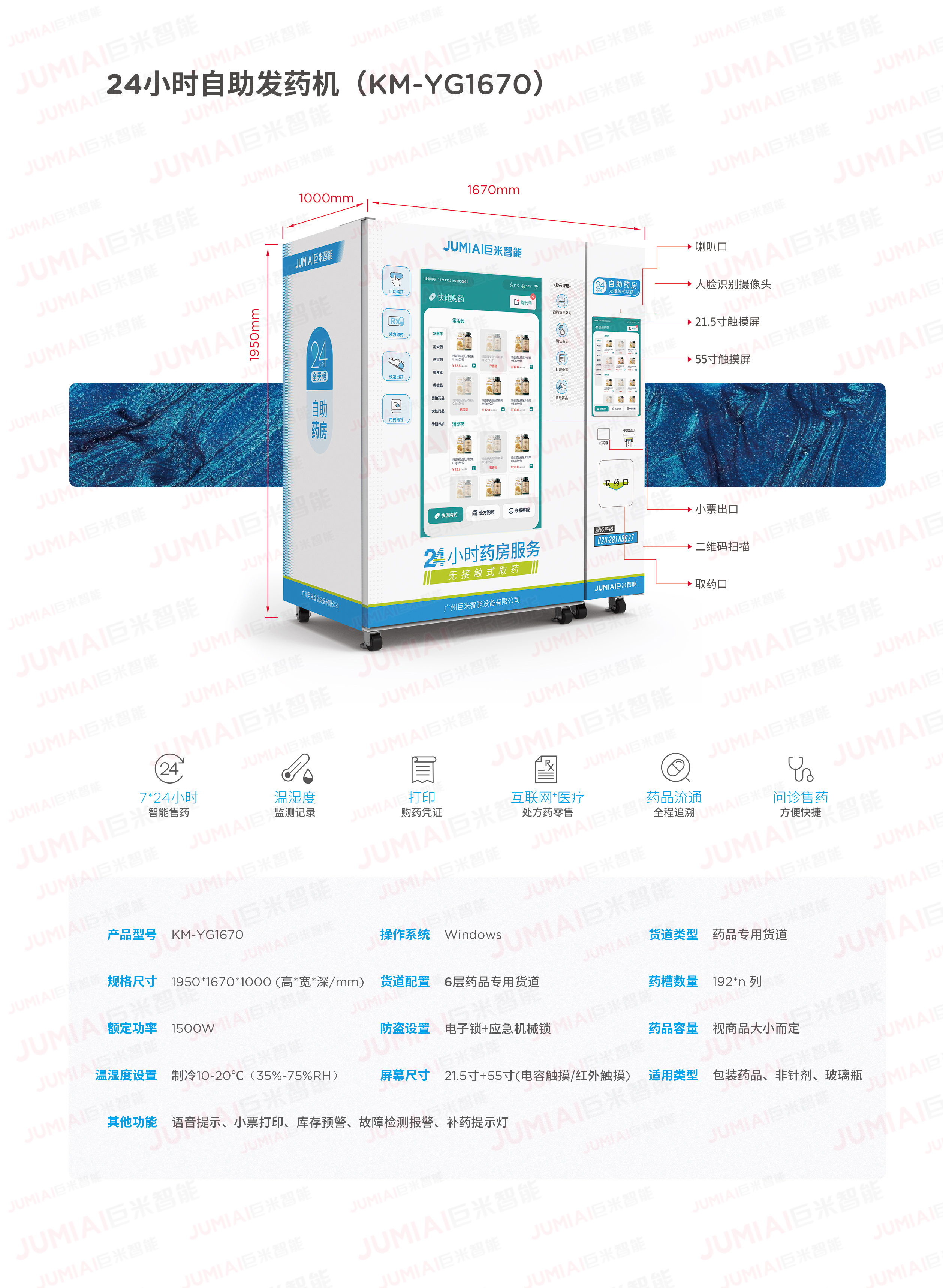 规格尺寸: 1950*1350*980 药品检测: 红外检测 额定功率: 1000W 湿度设置: 35%-75% 医保支付: 选配、定制开发 防盗设置: 机械锁 货道类型: 药品专用货道 温度设置: 10℃-20℃ 货道配置: 6层药品专用货道 药品容量: 视药品大小而定