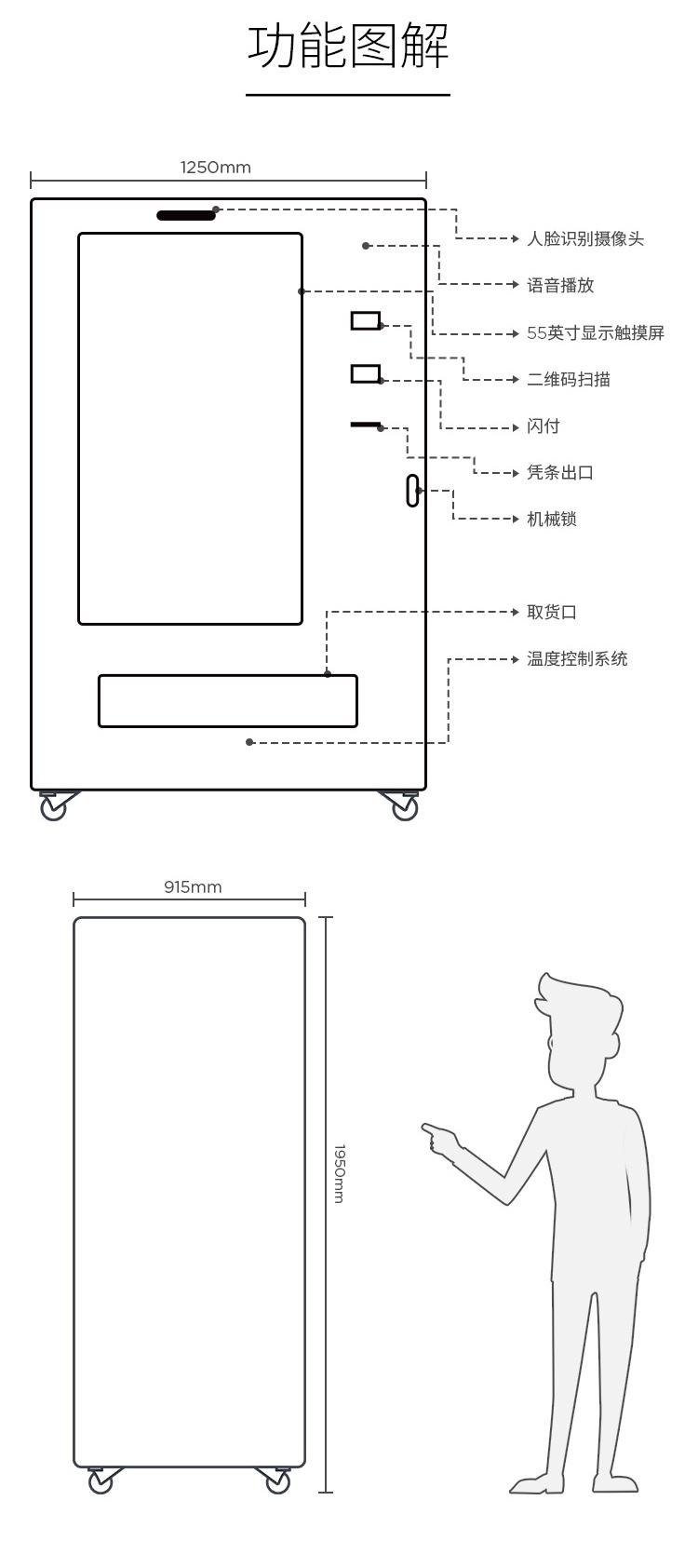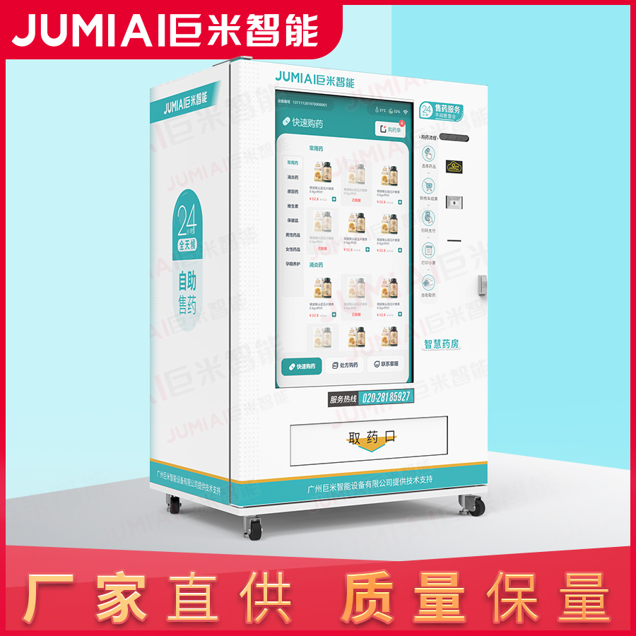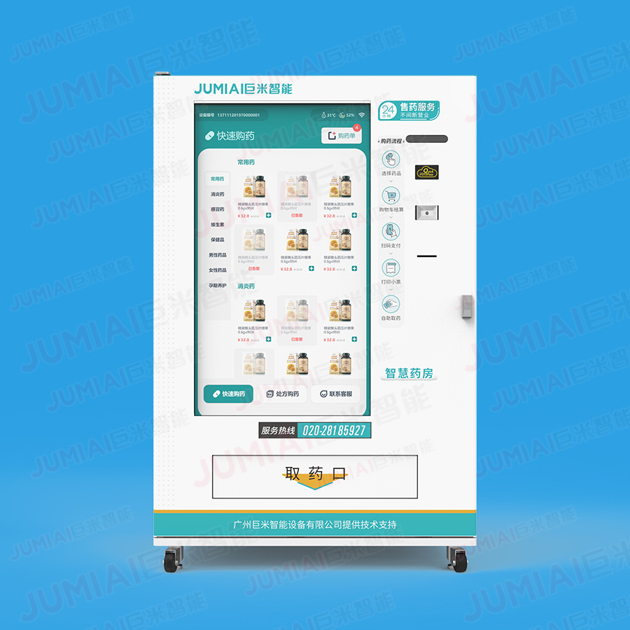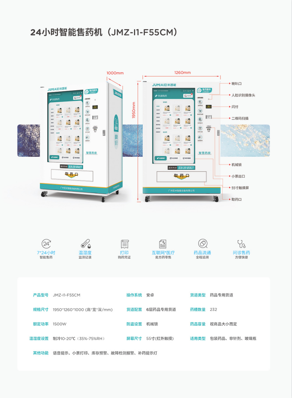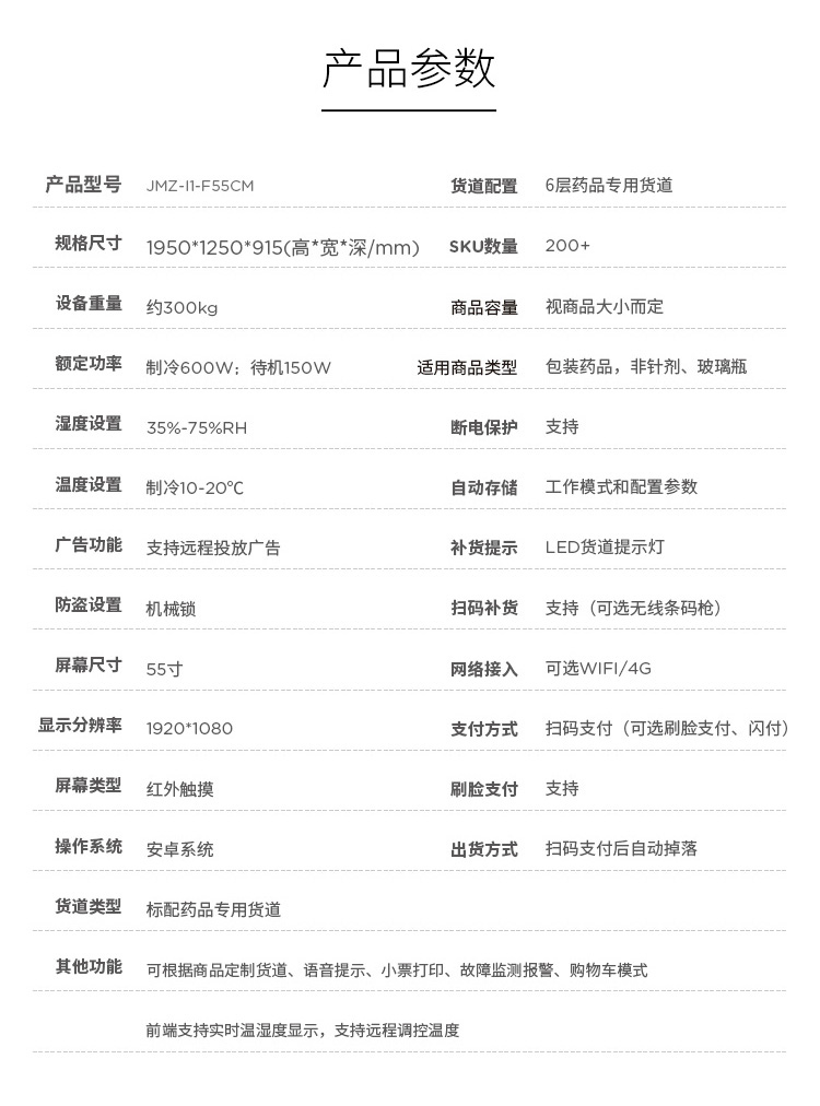 额定功率: 2000W 货道类型: 药品专用货道 货道配置: 7层药品专用货道 药品容量: 视药品大小而定 药槽数量: 266*n列 适用类型: 包装药品、非针剂、玻璃瓶 防盗设置: 电子锁+应急机械锁 温度设置: 10℃-20℃ 屏幕尺寸: 21.5寸(电容触摸) 湿度设置: 35%-75% 小票打印: 支持/打印购票凭证 扫码出药: 支持 型号: JMZ-11-F55CM