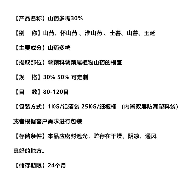 外观: 精细粉末 检测方法: UV/HPLC 保质期: 24个月 包装: 纸板桶 溶解性: 全水溶 提取来源: 山药 主要成分: 山药多糖 质量等级: 食品级 储存方式: 干燥避高温处 应用范围: 多种 净重: 25kg 工艺: 喷雾干燥